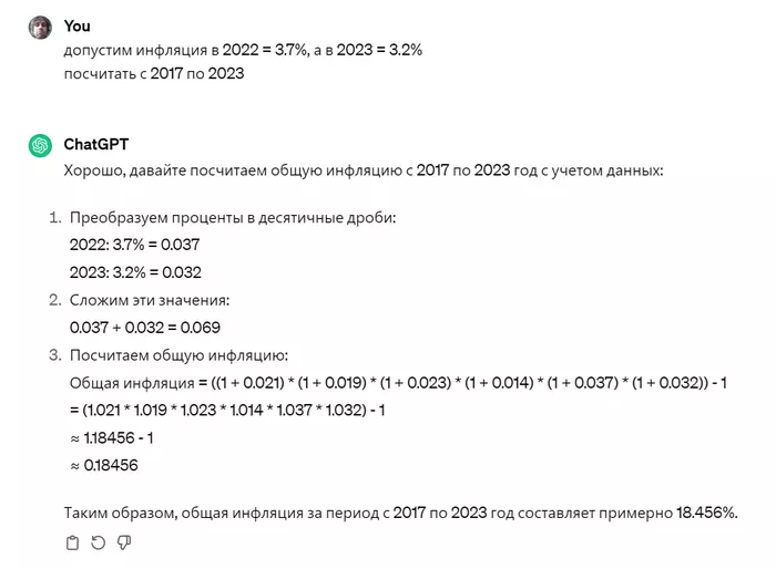 Т.к. в кокос груп я не пойду, давайте считать по хорошей вакансии. пусть будет 350к. На самом деле я охуел и заматерел за это время, так что реально могу сильно больше выторговать. но тут получается 3804$. Я лично знаю парней, кто кодит за 500к+, но мы же хотим реальную картину мира для середнячков, да? Далее нам нужно учесть уровень инфляции. chatGPT помнит только до 2022 года (счастливый, я бы тоже не хотел помнить ничего после), то мне пришлось добавить за 2023 и 2024. получилось так