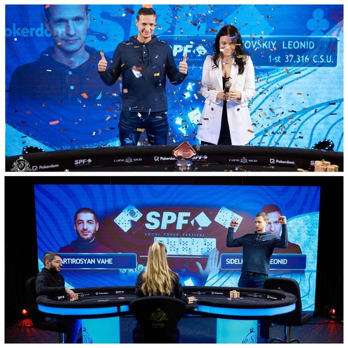 У Ваге остался стек в 1,000,000 фишек, у Леонида стало 2,600,000. Спустя пару раздач все закончилось. Мартиросян комплитом завел , Сидельковский чекнул с .