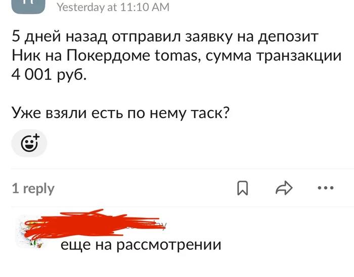 Заявка по депозиту была передана через бота. В такой ситуации к вам приходит автоматическое уведомление, что она принята. Далее саппорт отвечает только, когда ситуация решается с платежом.