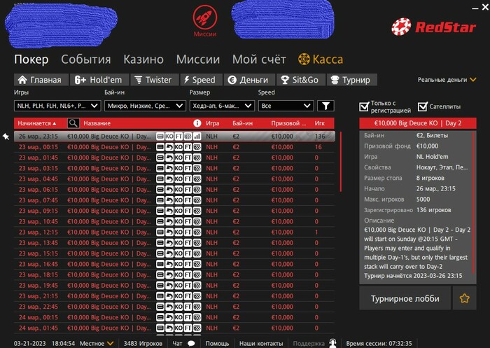 Red_Star, туда тоже напишу, но вот просто покажу скрин того, что показывает при "посмотреть все турниры" для имеющихся билетов. Почему-то регнуться можно только с 23-го числа. Но эти турниры идут каждые 1.5 часа. Не за билеты, а за деньги можно регаться в те, которые идут сегодня и завтра (вчера я за кэш регался). И начались они ещё в вск. И я не уверен, что потом и 23-е не съедет дальше.... проблема явно не у меня одного, ибо народ заранее регается в турнир 23 марта в 00.15.