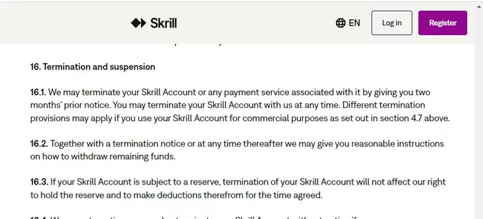 16.1. Мы можем закрыть ваш счет Skrill или любую связанную с ним платежную услугу, уведомив вас об этом за два месяца. Вы можете закрыть свой счет Skrill в любое время. Если вы используете свой счет Skrill в коммерческих целях, как указано в разделе 4.7 выше, могут применяться другие положения о закрытии счета.