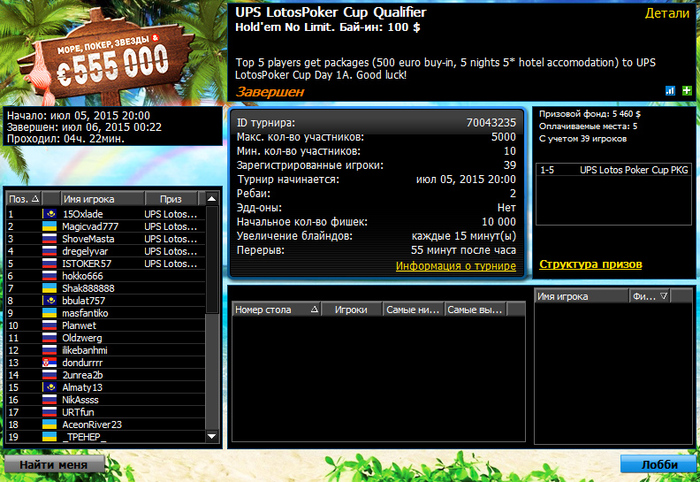 Турнир окончен, а у нас ещё пятеро обладателей пакетов на UPS LotosPoker Cup: 15Oxlade (Казахстан) Magicvad777 (Украина) ShoveMasta (Россия) dregelyvar (Россия) ISTOKER57 (Россия)