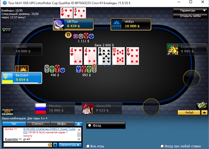 Стоит добавить, что за нашим столиком примостился еще "Bectolo4" - игрок, имевший наибольший стек на момент завершения первого сателлита, а также некий "IIобедиТeJb" в отношении к никам которого читается образ любителя пускать газы, хорошо известного участникам сателлитов "Лотоса".