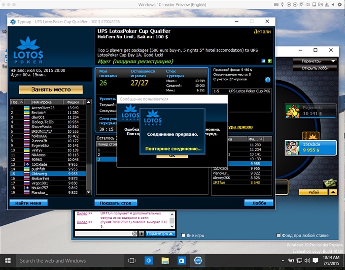 P.S. В общем, не плюйте на меня с высокой колокольни, но я больше уже не могу... Львиная доля времени уходит на то, чтобы как-то раком подключиться, после чего в течение 15 минут тебя все равно неизбежно выбивает. Попробую присоединиться к вам ближе к финальному столу, когда будет решаться судьба пяти путевок на UPS Grand Final в Кирении.