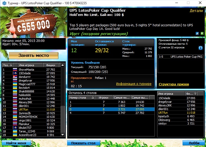 В UPS Qualifier новый уровень блайндов - 100/200/25. В игре - 29/34.
