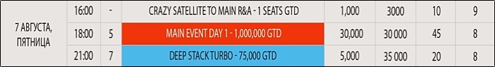 В 16:00 - крэйзи-сателлит на главный турнир SPT. Вступительный взнос - 1,000 рублей. Стартовый стек - 3,000 фишек. Уровни по 10 минут. Поздняя регистрация и ребай - в течение первых девяти уровней. Последняя возможность попасть главный турнир через "боковую дверь". Ультракороткие стеки и стремительно сменяющиеся уровни предполагают сумасшедший экшн.