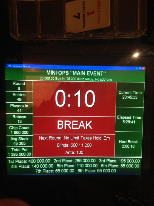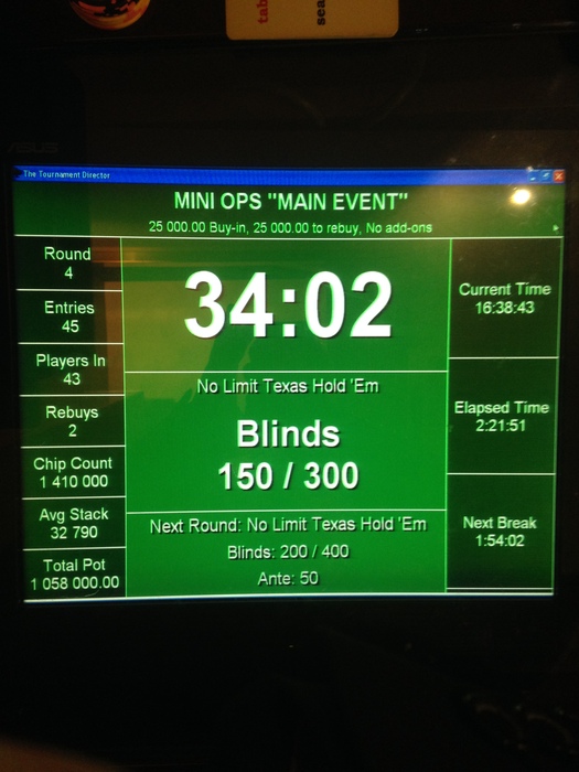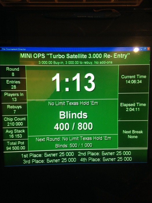 Сейчас в игре 26 человек и 2 стола кэша 50/100, результаты турнира снова утром и до встречи завтра на Main Event по 25.000 и Гарантией в 1.000.000 руб.