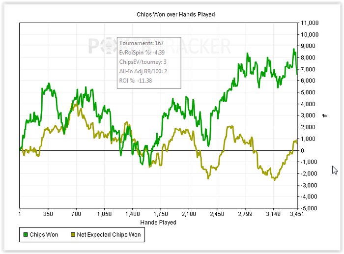 Перестройка в целом улучшение EV в хедзапе, зато полностью угробила нормально отработанный 3макс. Я хз, как так получилось. Похоже, когда я играю в неоптимальном состоянии (недосып, голод, алкоголь, лишние мысли) - я перестраиваю игру целиком как агрессивную или пассивную. Принял решение играть агрессивнее хедзап (и в моем случае это правильное решение) - автоматически заиграл лузовее в 3максе, где и так уже играл довольно лузово. В итоге - chipEV в 3максе за месяц 17 (семнадцать, Карл!), при нормальном для меня значении 23-25.