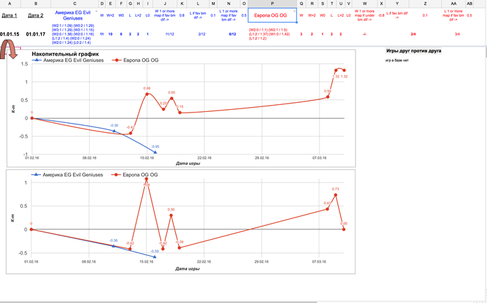 seeya @ 11.3.2016 На заказ "слепили" полезный отчет (таблицы Google) для ставок на Dota 2 (пре-гейм). На мой взгляд, дает существенный БУСТ пре-ставкам, за счет важной статы