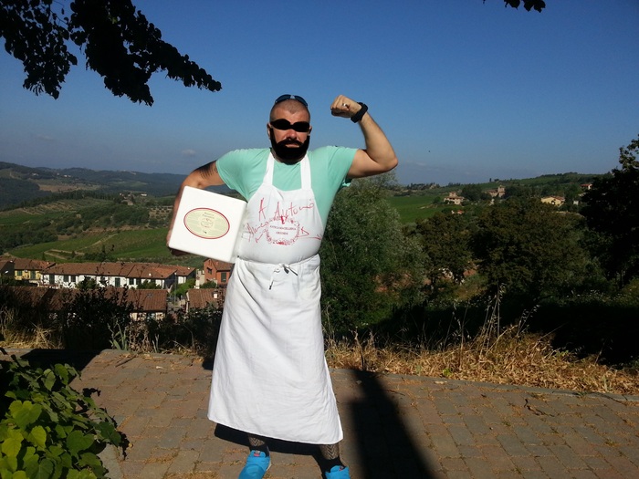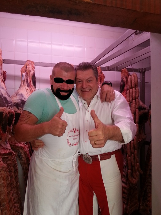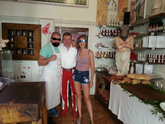 В эту поездку мы специально остановились тут на четыре дня. Сказать что мы охренели от удовольствия, не сказать ничего. Это было нереально. Настоящая мужская еда - сырое мясо. Плюс тосканские сыры, прошутто и молодое вино. Феерия обжорства и праздник живота. Плюс сам Дарио невероятно харизматичный и обаятельный мужик. Сильный, как ссуко буйвол. Когда с ним фотографируешься он сжимает рёбра до хруста. Ему 61 год, 50 из которых он ест сырое мясо и машет топором. И я ему завидую - настоящая мужская работа. Он конечно медийный и раскрученный персонаж, но при этом открытый и без понтов. В утро перед отъездом мы пришли купить мяса, Дарио не только устроил нам фотосессию, но и когда узнал, что мы спецом приехали в Пацано на несколько дней, по дружески обнял меня и подарил свой рабочий фартук. Он (фартук) до сих пор восхитительно пахнет свежим мясом.