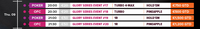 Сателлиты на главные турниры уже стартовали, по мере приближения начала самой серии Glory Series мы добавим ещё больше сателлитов на турниры. Так что не забудьте также проверить турнирную вкладку в секции ОКП для регистрации в сателлитах на турниры по открытому китайскому покеру.