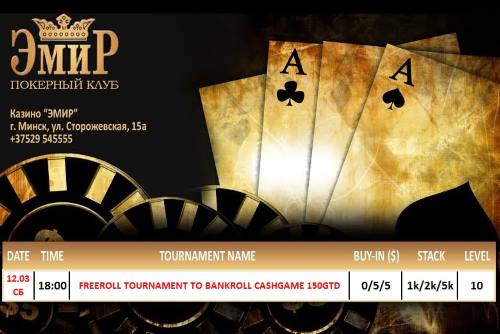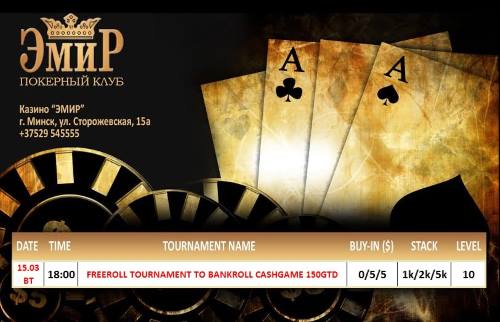 Друзья, приглашаем Вас в покерный клуб "Эмир"! Сегодня, у нас Турнир - FreeRoll R&A 0/5, в котором гарантированы два призовых места по 75 у.е., для увеличения Вашего банкролла на кэш-игру. Кэш-игра начнётся в 19:00. Будем рады Вас видеть у нас в гостях!!! Все подробности по телефону +375295455555