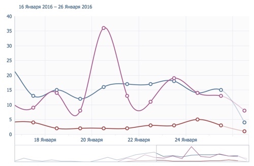 Пики активности в разных городах, впрочем, бывают разными. Фиолетовая кривая - Новосибирск, синяя - Барнаул, красная - Новокузнецк. Легко проследить: взрыв в столице региона произошел в момент старта сателлитной программы и закладывания костяка группы. Барнаул одинаково стабилен в районе 15-20 человек день, а тот же Новокузнецк - 3-5. Легко вычислить причины всплеска интереса к APT со стороны Питера - после активных контактов с ОЛПТ, это еще плюс 10-12 входов.