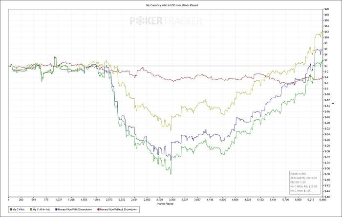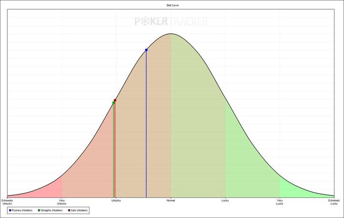 Вчера сыграл 2 сессии: сперва короткую и после перерыва уже нормальную. В первой выиграл +6.93, а вот вторая получилась просто ужасной. За 1.5к раздач (в зуме это примерно 1.5 часа игры) я проиграл 19(!) бай-инов. Такого раньше никогда небыло. Примерно половину (чуть меньше) из этого был недобор по EV, примерно треть - кулера, в которых отскочить было малореально, и остальное - моя плохая игра. Честно говоря, было даже интересно сколько продлиться эта полоса неудачная