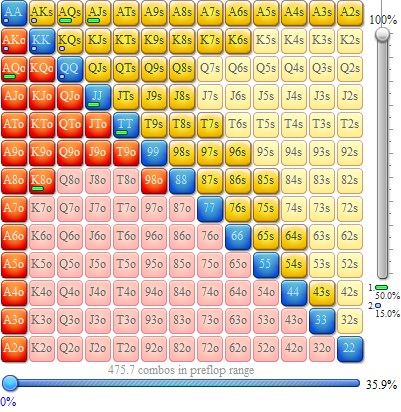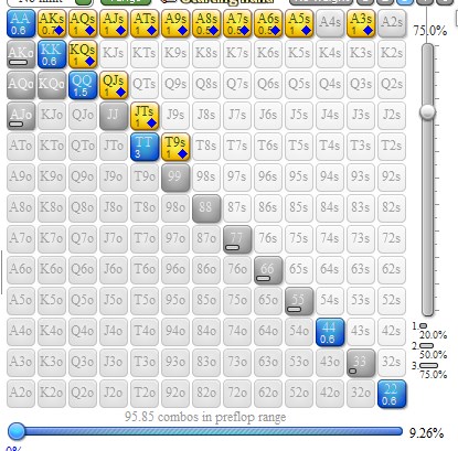 Префлоп: 99-22,AJo-A2o,KQo-K9o,QJo-Q9o,JTo-J9o,T9o,98o,ATs-A2s,KJs-K5s,QJs-Q8s,JTs-J8s,T9s-T7s,98s-96s,87s-85s,76s-75s,65s-64s,54s,43s,[50]JJ-TT,AQo,K8o-K7o,Q8o,AQs-AJs,K4s,Q7s[/50],[15]AA-QQ,AKo,AKs,KQs[/15] Задаю малый процент премиум рук, т.к. совсем исключать их нельзя. Опп колит достаточно широко