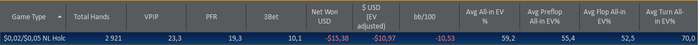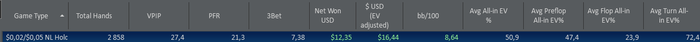 Start Bankroll 452,08$; Stop Banrkoll 464,43$; Cтолов 6; Мини сессий 5; Рук: 2858; Время = 300 мин; Результат = 12,35$; bb/100 = 8,64;Моя оценка = 3 з 10. Цель на день Net Won(24$) выполнена на 51,4%; Цель на день Hands (3000) выполнена на 95,2% Цель на первый игровой отрезок (47,92$) выполнена на 25,7% Цель Руки на первый игровой отрезок за все дни (17К) выполнена на 180,5% (30701 рука); Цель Win Rate на первый игровой отрезок за все дни (137,69$) выполнена на 74,4% (102,53$); Comment: Хороший день по игре, в последней мини сессии Себя немного переиграл