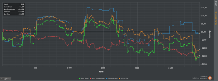 Start Bankroll 467,46$; Stop Banrkoll 452,08$; Cтолов 6; Мини сессий 5; Рук: 2921; Время = 300 мин; Результат = -15,38$; bb/100 = -10,53; Моя оценка = 0 з 10. Цель на день Net Won(11$) выполнена на -139,8%; Цель на день Hands (3000) выполнена на 97,3% Цель на первый игровой отрезок (32,54$) выполнена на -47,2% Цель Руки на первый игровой отрезок за все дни (17К) выполнена на 163,7% (27843 руки); Цель Win Rate на первый игровой отрезок за все дни (137,69$) выполнена на 65,4% (90,18$); Comment: Провалил день.
