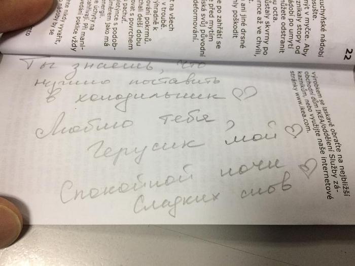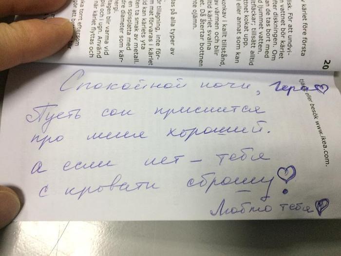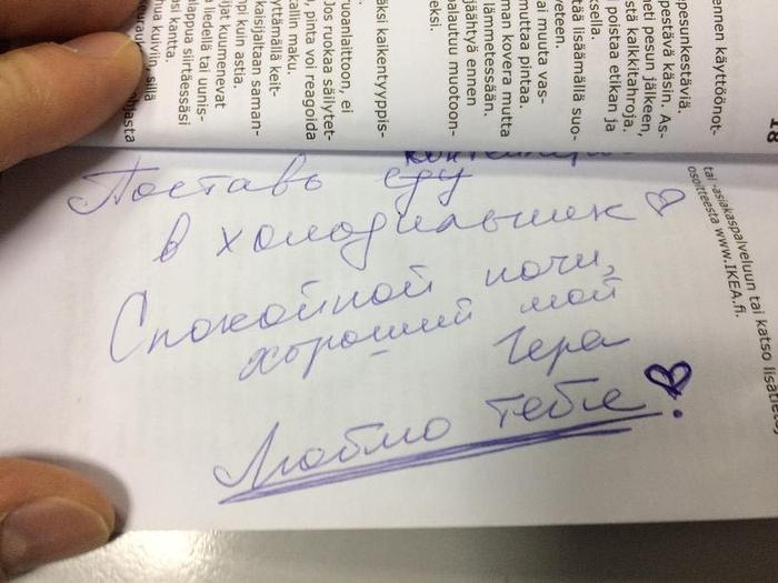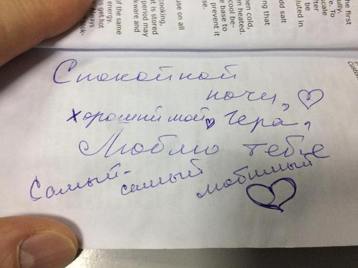 И в честь этого хочу опубликовать милоту, которую она мне иногда пишет на ночь после того как уходит спать, а я ещё работаю. Начиналось с простой напоминалки После моего возмущения о сухости записки, сообщения уже были более тёпыле и вот как они менялись. Написано на какой-то инструкции, но я чувствую в этих записках столько тепла и заботы...