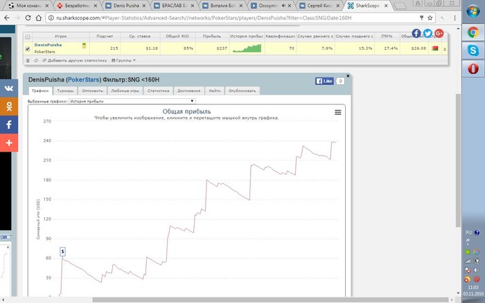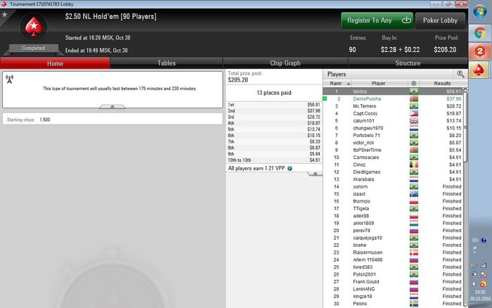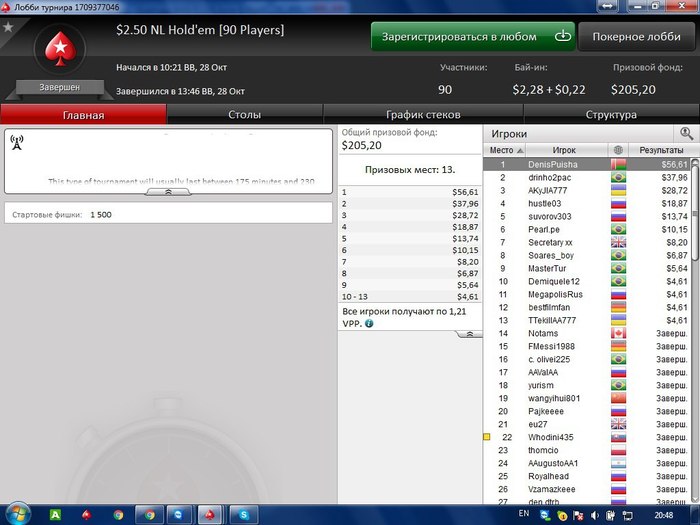 Привет-привет! Начал катать. Сегодня правда 32 турнира всего. Начиналось как всегда всё хорошо, пару предфиналок и финалок на 90МАХ_KN по 1.5, но трижды не потащил 70-на30((( Дальше всё хорошо закрутилось в 90МАХ по 2.5уе, которую в итоге успешно закончил ТОП1, начал подгружать их по немногу, после этого оставалось 8 турниров и где то был очень короткий, а в 3турнирах вылетел за минут 5-7 префлоп выставления АК в АА((( Как итоге +25$