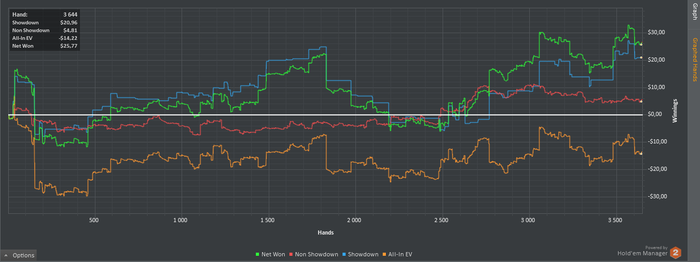 Start Bankroll 676,88$; Stop Banrkoll 696,11$; Cтолов 6; Мини сессий 5; Рук: 2935; Время = 300 мин; Результат = 14,16$ ; bb/100 = 8,88; Моя оценка = 5 з 10. Цель на день Net Won(15$) выполнена на 94,4%; Цель на день Hands (2800) выполнена на 104,8% Цель Руки на третий игровой отрезок за все дни (100К) выполнена на 51,3% (51326 рук); Цель NW & RB на третий игровой отрезок за все дни NW (400$) выполнена на 32,6% (130,73$), RB (100$) выполнена на 60% (60$); Comment: Не очень карта заходила и складывалось тоже не очень, но игрой полностью доволен, выставлялся правильно, просто в олл-инах складывалось и из-за этого ЕВ съел.
