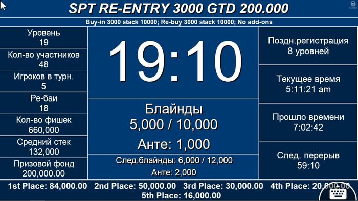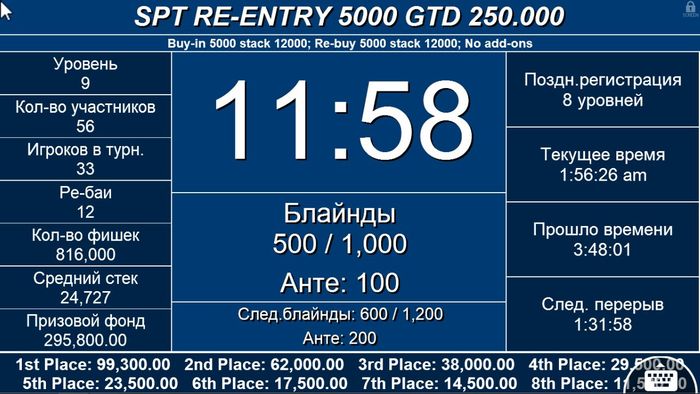 В 18:00 прошёл сателлит на вечерний турнир, участвовало 22 человека, было разыграно 6 билетов. В 22:00 был запущен турнир по 5000 в формате RE-ENTRY, который собрал 56 участников, призовой фонд составил 295.800руб. Информация и распределение призовых в скриншоте: