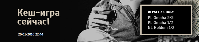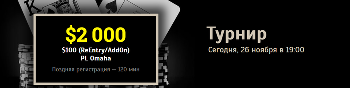 Кроме кеша, сегодня в 19-00 также пройдёт турнир по PL Omaha 100$ Re-Entry (2K gtd), так что можно подойти и любителям турнирного покера