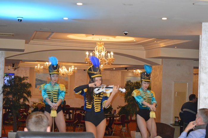 В девять вечера гости клуба подкрепились говядиной Веллингтон от "Блэк Дор", фото не осталось, просто поверьте на слово, что очень вкусно. А часом позже к нам приехали гусары скрипачка Маргарита Лапинская и шоу-балет "Miami Dance"