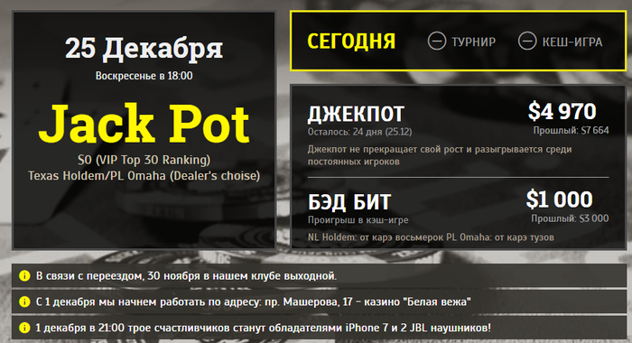 пацан_с_завода @ 30.11.2016 написали бы чтоли, здесь или на своем сайте, что сегодня клуб уже все, не работает. Ни кеш-игры, ни обещанного розыгрыша 30.11 в 21:00 не будет. А переносится все на завтра и в новый клуб. А то приехал, а там уже одни голые стены.