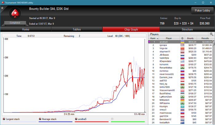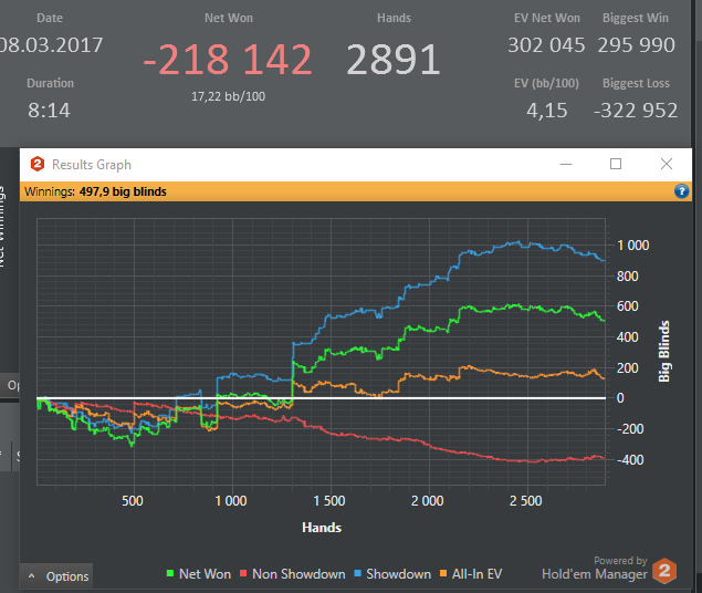 штук 5 неплохих топ50 было в какой-то момент и я даже поверил ненадолго, что везде всё будет хорошо и смогу даже денег каких-то заработать Но к сожалению бест резалт получился средненький(он и есть профит за день можно сказать) ещё в 2х финалках слетел в топ6 Топ2 конечно кислосладкий получился. Состав хороший был - оч много все фолдили, а мне заходило как раз на подстилить Но тут чел зарейзил с ко со стэком 8 или 9 бб и я решил, что у меня есть много фэ против него, т.к он был нитоватый- и я подумал, что все хорошие он пушить будет, даже топ5%спектра и задвинул в него свои 44 - а там < АК. Осталось уже у меня 5бб. Распихался-крутнулся. Выставляюсь значит АК в АД за 70% всех фишек и как заору на всю квартиру "СУккаааа" ...надеюсь мои новые соседи в это время на работе дама тёрном, а это всё ещё топ5...Опять огрызок, 3бб, и хз каким чудом, но опять крутнулся и вышел в хедзап 6 к 1 примерно, в мою, но чел оказался не такой простой и за 5 раздач ёбнул меня на всё)) такиие гипертурбо Тем не менее,да, первая сессия в плюс за много дней - уже неплохо)