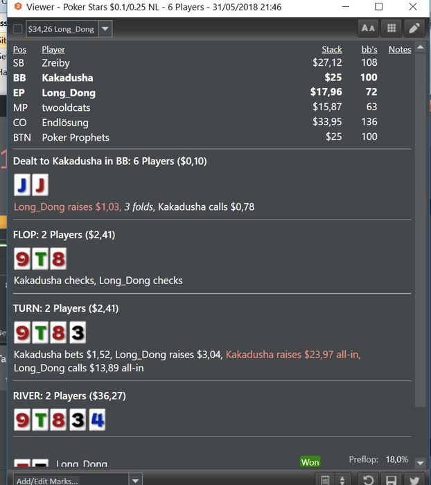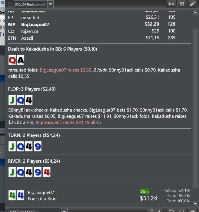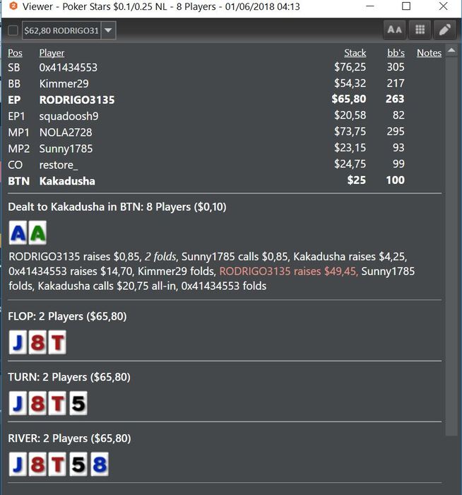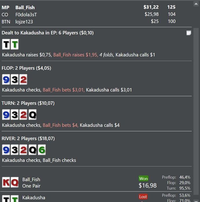 Вот по этой раздаче я сомневаюсь. Как ее надо было сыграть -вопрос. 4 бетить и фолдить на 5 бет? как вариант. фолдить на 3 бет - не вариант, у него широкий диапазон 3 бета. Считаю,всё же надо было 4 бетить, так было бы проще играть и не было бы сложных решений на постфлопе. Тем более мы без позы, однозначно 4 бет - фолд.