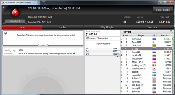 Была еще одна непрофильная карапуля, там в топ-6 на бабле. С двумя короткими за столом давил в двух средних и чипа, поднял до чипа, но потом пару раз прям не сложилось. В деньги, конечно, зашел, но уже коротким.