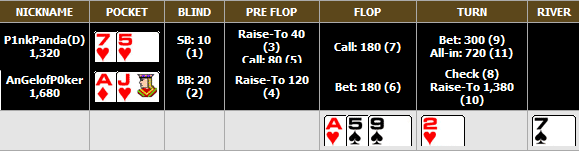 Сразу видно, что неплох по игре и соображает в Heads Up. Но я сегодня играю в А-game, поэтому со мной опасно связываться. Он видимо этого не учёл и решил помериться пиписьками. Рейзы, ререйзы, 3 беты и 4 беты...классная игра была. В итоге я его так изводил, что он в конце видимо выходил из себя и пушил с досады. В чате молчал, к моему сожалению, но для чего он подсел я так и не понял. Китайцы, чего с них взять...(я не расист!).
