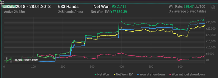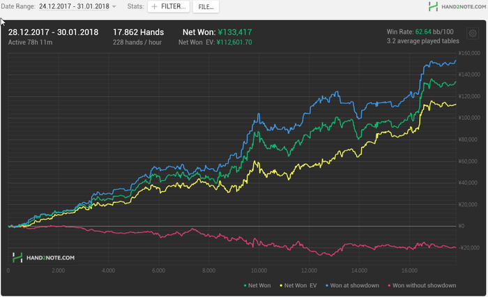 Всем привет. Наконец-то заработал х2н нормально и начал трекать все руки на всех столах. Неделя пересылок логов саппорту не прошла зря! Правда прошло половина лицензии, но дальше надеюсь будет ок работать. Выкладываю как и обещал график того что есть с конца декабря до сейчас. На самом деле в декабре все 500рук попало, поэтому можно считать, что за этот месяц.