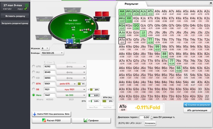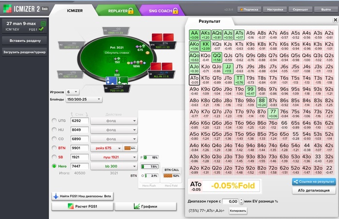 Еще раз привет!!!Нет 27 мен 9 макс Исм ев стоит в расчетах 6 потому что нас 6 за столом.Понял тебя.Ну можно любую или почти любую ситуацию в свою сторону вырулить играя в игры разума. Почему ты думаешь что бу не будет рейз коллить как говорит неш все что открывает ему стек позволяет колоть.А 15% это мне неш задал такой диа,я не вижу смысла от него отклоняться ибо баббл шире пушить уже минусово так как след поза у меня бу и еще в принципе есть один круг чтоб мне постараться удвоиться(пихнуть первым или за 3бет пушить более годную руку)так что 30% пиха у меня там никогда не будет. По поводу пиха 66 мне как бы пофиг - моя турнирная доля остается неизменной(даже скорее всего она даже немного растет хоть ты 22 репушишь или а2о это не принципиально),но ты то кроме меня еще же рискуешь на стек против рейза равного себе стека и пусть он будет закрывать тебя на 2.1% что будет редко,просто я понять не могу зачем лишний риск ради чего тут так исполнять???Фолд с 66 и даже с 77 самое выгодное действие-88+ Атс+ АВо да изи репуш.