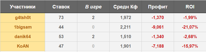 danik64 1 Viktor Troicki - Guillermo Garcia-Lopez П1 1,322 2 Thomaz Bellucci - Diego Sebastian Schwartzman Ф1(+1,5 сета) 1,454 3 Roger Federer - Benoit Paire П1 1,100 4 Mohamed Safwat - Gael Monfils П2 1,040 5 Jonathan Eysseric - Hubert Hurkacz П2 1,790 6 Andrew Whittington - Sora Fukuda П1 1,252 7 Yuichi Sugita - Agustin Velotti П1 1,312 8 Akira Santillan - Casper Ruud П2 1,515 9 Shuai Peng - Kai-Chen Chang П1 1,292 10 Adrian Mannarino - Taylor Fritz П2 1,680 11 Andy Murray - Malek Jaziri П1 1,049 12 Marius Copil - Jan-Lennard Struff П1 2,030 13 Тomas Berdych - Lukas Rosol П1 1,133 14 Mischa Zverev - Rafael Nadal П2 1,142 15 Kyle Edmund - Sam Querrey П2 1,854 16 Novak Djokovic - Martin Klizan П1 1,083 17 Dominic Thiem - Gilles Simon П1 1,581 18 Jack Sock - Yoshihito Nishioka П1 1,222 19 Juan Martin Del Potro - Francis Tiafoe П1 1,181 20 Sara Sorribes Tormo - Ying-Ying Duan П2 1,416 21 Tomas Berdych - Robin Haase П1 1,200 22 Roger Federer - Evgeny Donskoy П1 1,028 23 Steve Johnson - Ernesto Escobedo П1 1,32024 Shuai Peng - Magda Linette П1 1,302 25 Marc Polmans - Blake Mott П2 1,512 26 Dominic Thiem - Adrian Mannarino Ф1(-3,5) 1,564 27 Ajla Tomljanovic - Kirsten Flipkens Ф1(+1,5 сета) 1,531 28 Christina McHale - Taylor Townsend П1 1,502 29 Pablo Cuevas - Facundo Bagnis П1 1,362 30 Sam Querrey - David Goffin Ф1(+1,5 сета) 2,070 31 Evgeny Donskoy - Lucas Pouille П2 1,370 32 Andy Murray - Philipp Kohlschreiber ТБ(18) 1,531 33 Robin Haase - Damir Dzumhur П2 2,260 34 Gerald Melzer - Diego Sebastian Schwartzman П2 1,370 35 Steve Johnson - Marin Cilic П2 1,408 36 Yoshihito Nishioka - Rafael Nadal П2 1,066 37 Kirsten Flipkens - Kristina Mladenovic П1 3,490 38 Paul-Henri Mathieu - Jonathan Eysseric П1 1,383 39 Novak Djokovic - Nick Kyrgios П1 1,333 40 Fernando Verdasco - Robin Haase П1 1,454 41 Pablo Cuevas - Diego Sebastian Schwartzman Ф1(+1,5 сета) 1,495 42 Andy Murray - Lucas Pouille П1 1,138 43 Magda Linette - Ying-Ying Duan П2 1,746 44 Marin Cilic - Rafael Nadal П2 1,36945 Christina McHale - Kristina Mladenovic П1 2,100 46 Yuichi Sugita - Blake Mott П1 1,584 47 Nick Kyrgios - Sam Querrey Ф1(-1,5 сета) 1,847 48 Nao Hibino - Magda Linette П2 1,649 49 Quentin Halys - Michal Przysiezny П2 2,070 50 Andy Murray - Fernando Verdasco ТБ(19) 1,699 51 Pablo Carreno-Busta - Pablo Cuevas Ф2(+1,5 сета) 1,520 52 Sam Querrey - Rafael Nadal П2 1,200 53 Nao Hibino - Ashleigh Barty П2 1,253 54 Yuichi Sugita - Soon Woo Kwon П1 1,487 55 Jurgen Melzer - Michal Przysiezny ИТБ1(12,5) 1,800 56 Pablo Cuevas - Albert Ramos-Vinolas Ф1(-1,5 сета) 2,470