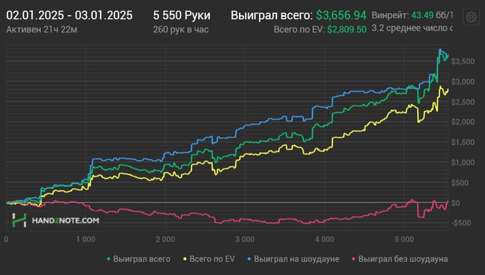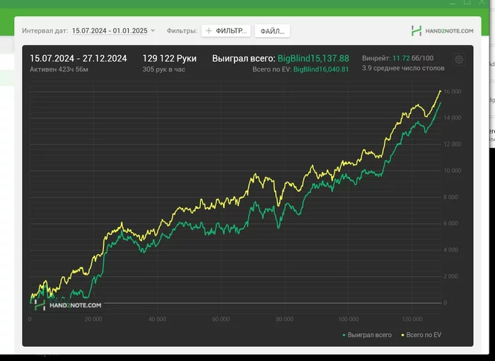 Привет. Хочу поделиться своими результатамм . Очень много лет уже играл 25нл-50нл с винрейтом + 3бб. Обратился к Юре за тренировками и не пожалел. После плотных занятий с ним , 2024 год уже играл 100нл-200нл. Год закончил около +6 бб (лимиты 100-200) на графике не все руки попали в базу.