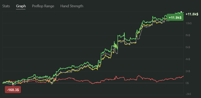 Уже писал здесь в начале октября с отзывом на сотрудничество с Юрой. Продолжаю обучение в группе, всё так же доволен его системностью процесса обучения, который позволяет расти по лимитам не в ущерб винрэйту. Сейчас играю микс 100-600 в приложениях, в этом месяце пробил новый bestmonth +8к$.