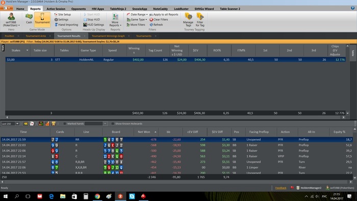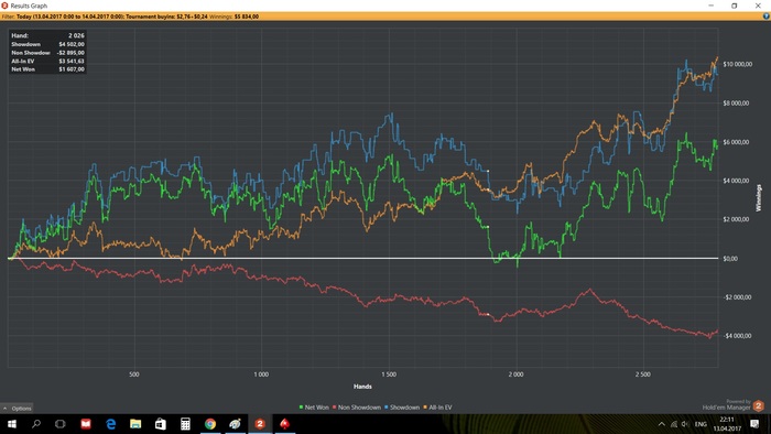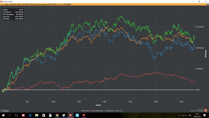 estim, в цифрах я отыграл 1000 с профитом 172$, но профит по EV у меня был 77$, т.е. я страховке отдал 95$. Разницу я отдал. Сейчас к примеру я отыграл 250 игр с профитом -42$, а EV профит у меня должен был быть +12$, т.е. если бы сейчас был расчет со страховкой то мне бы выплатили разницу в +54$. Понял в чем прикол? Если проигрываешь страховка тебе возмещает разницу между EV, если ты выиграл больше чем по EV ты отдаешь страховке. В общем в любом случае ты не можешь оказаться в минусе по итогу, главное что бы EV было)) Что то не ясно, спрашивай.