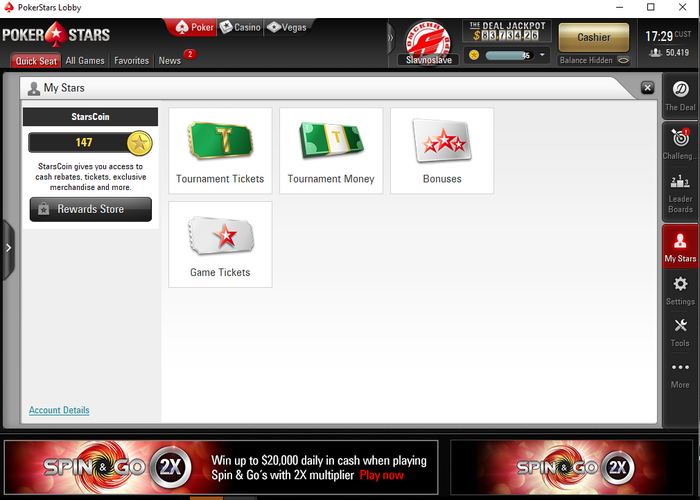 Slavnoslave, а ты ещё не заходил на ПокерСтарс в раздел спортивных ставок? Я всё побаиваюсь зайти туда, всё таки ставки - одна из моих зависимостей, с которыми удалось справиться. Но вот сегодня обнаружил в главном лобби новую для меня картинку в меню справа под названием "MyStars", тисканул - а в ней есть раздел "Бесплатные ставки". Заманивают...
