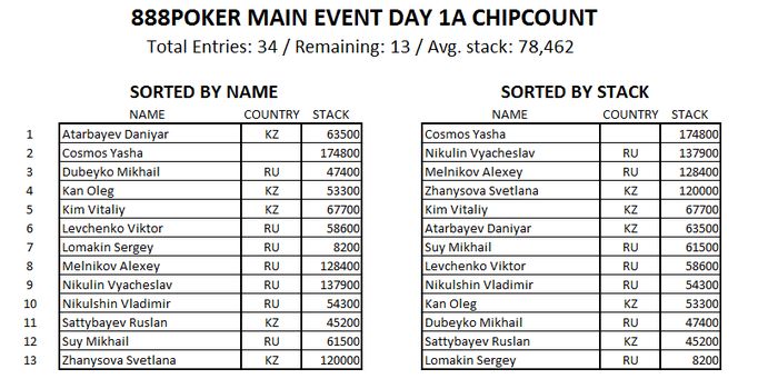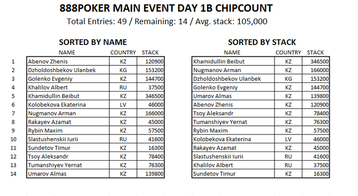 Имена и стеки игроков, прошедших в "Day 2" Мэйна из Дня 1А: