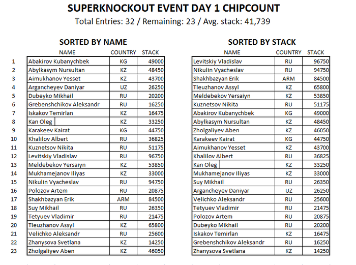 Сегодня в 22:00 состоится продолжение турнира SUPERKNOCKOUT EVENT, где из вчерашнего дня в сегодняшний прошли 23 игрока из 32 вошедших. Игра продолжится с 7-го уровня блайндов 300/600 (75).