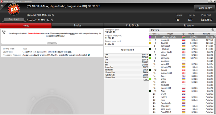 Целое лето пытался набить БР для мини вкупов , что бы доехать на вкупах и положить большой болт на учебу вместе с Польшей. Цель выполнена – наступают сами Вкупы. В первом же вкупе по омахе Х/Л прохожу во второй день с 5 стеком из 30. Вылетаю очень обидно. Вкупы идут я ни где не могу зацепиться за второй день. Наступает момент поездки на BPT , выступил плохо (как по результатам , так и по игре ) . В один из дней на ВРТ мы решаем с Кирилом ( он же Kirill_ur , он же отец омахи ХЛ в Беларуси ) сыграть 55 омаху в долях 50 на 50 на первый вход. Начал я играть еще сидя в турнире в офлайне и третьей рукой мне сдают первый натс во второй и у меня за спиной 2к из начального . Но я не я если бы подвел бы уважаемого человека и раскрутился с 2к за 20 мин до 50к. Алл ин за алл ином я набиваю большой стек и еду домой на такси играя турнир . Перед выходом и такси я тащу важный флип и у меня становится 500к (2 средних ) и у Кирила такой же стек . Топ 150 и у нас два хороших стека . Пришел домой и вижу как вылетает мой напарник в очень дорогом флипе . 20 мин спустя вылетел и ваш покорный слуга - переапаный NoMoneyNoParty. Теперь с дикой мотивацией гриндить ,едет в страну на которую клал огромный х.. .