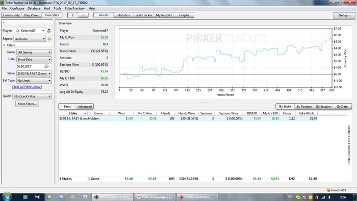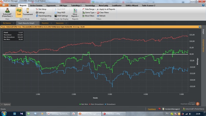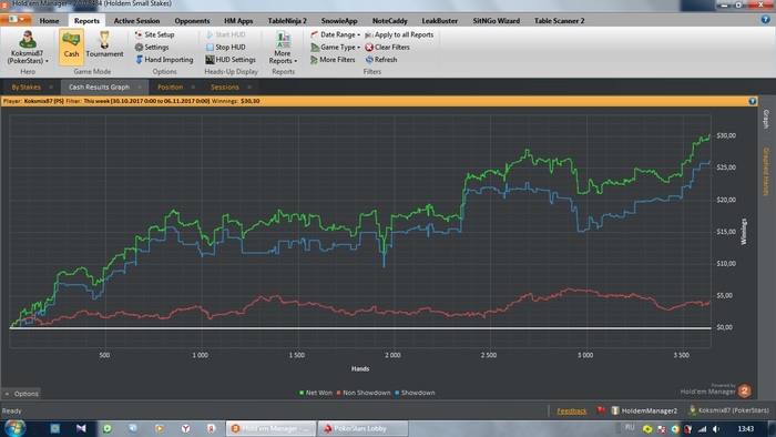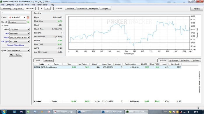 Покер трекер кончился) был пробник Но теперь у меня есть лицензионный ХМ2) я все также играю зум 6мах нл 2 Вобщем ничего нового Только мысль одна не дает мне покоя. Тренировки хочу взять до результата в академии покера. Обещают меня закрепить на нужном мне лимите Но цена не маленькая Вот и думаю. А что бить нл 50 это вполне хорошая трата времени) Ну а пока график за сегодня