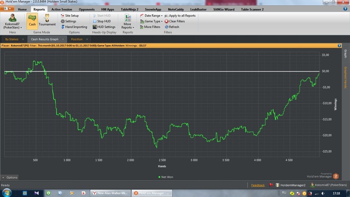 Вот и октябрь подошел к концу. Сентябрь я закончил в плюса, а вот октябрь... Вобщем сыграно почти 5к рук , а профит составляет минус 57 центов У нас снег и гололед, машины бьются, работы много, поэтому так мало рук отыграно График ниже
