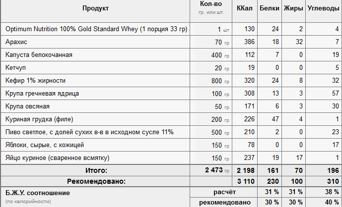 Рацион: ~2200 ккал/день БЖУ 2/1/3.