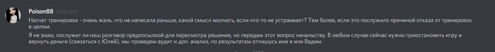 ssnowflakess @ 24.7.2017 Я получила от Димы 2 тренировки в марте, а в апреле, вопреки правилу меня опять поставили к нему. Выяснять и жаловаться на этот косяк я не стала (хотя проект здесь опять нарушил свои же прописанные правила), так как разрешается посещать любые тренировки других тренеров по своему желанию. Еще раз, я ничего не имею против Димы как человека, но он катает мой ранг и не катает старзы, и смысла от этих тренировок я не видела. Поэтому заранее предупреждала его о том, что меня не будет