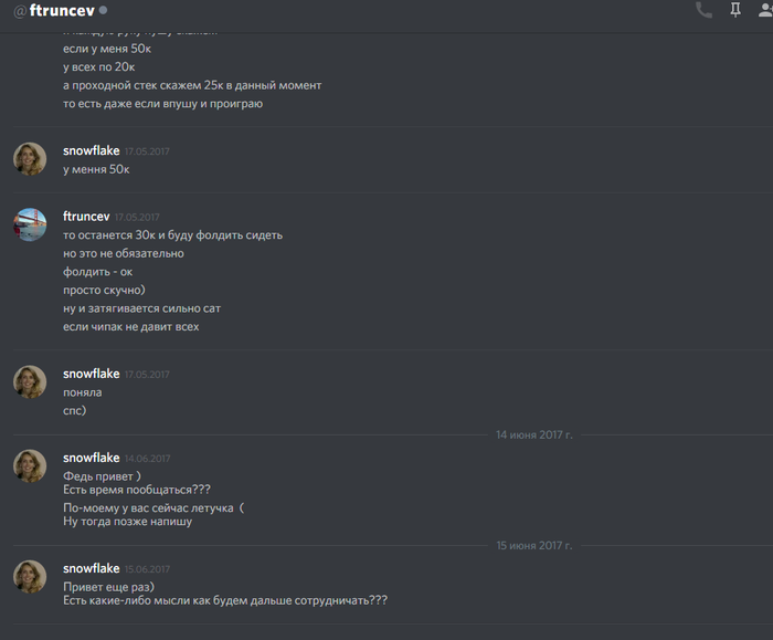 «Так я писал, что мы не против соблюдать договор до конца контракта – аби 2 цента и вперед. Банкролла в 200 би на никах (40$) более чем достаточно, пускай переводит излишки нам (как и прописано в контракте) и приступает к игре. Другое дело, что Снежане внезапно в таком случае уже неинтересно соблюдать договор. Но кто бы и сомневался.»