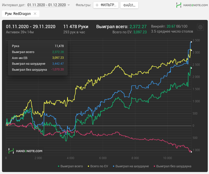 В итоге: 11к рук, 9 EVbb/100 (6,5 bb/100).