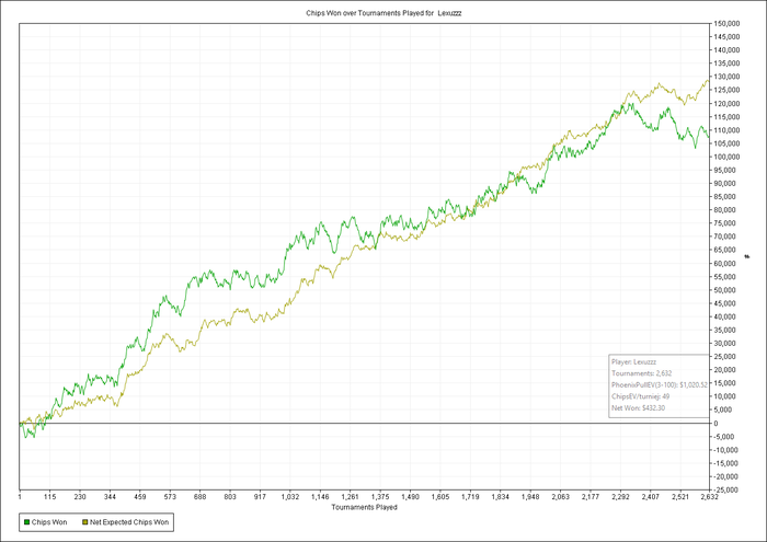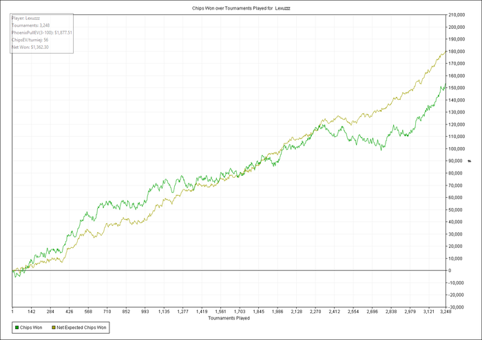 На примере графика фрика хорошо видно, что даже 20к турниров - это еще не факт, что бьешь лимит или ты его бьешь по ЕВ, а он тебя по деньгам, а ты наверняка пока столько не накатал