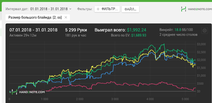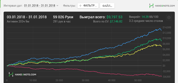 TsyhanouDzmitry @ 7.2.2018 Писать особо нечего , просто гринд, гринд , это бесконечный гринд , стал опять получать удовольствие от покера , закреплюсь на нл200 и сразу буду подключать нл400 . Честно признаюсь что переход на нл200 я не заметил . Наверное из за того что я миксую нл100 и 200 и много регов с которыми я играл сотку
